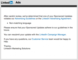 Kapitalistisen järjen vastaisesti LinkedIn usein kuitenkin ilmoittaa, että postauksemme eivät kelpaa ja pistää kampanjan poikki, eli kieltäytyy ottamasta vastaan markkinointieuroja.